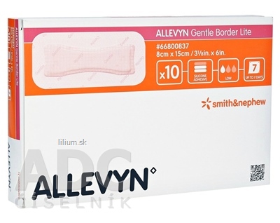 Allevyn Gentle Border Lite tenké adhezívne hydrocelulárne penové krytie so silikónovým gélom.Na rany so slabou alebo strednou mierou exsudácie.