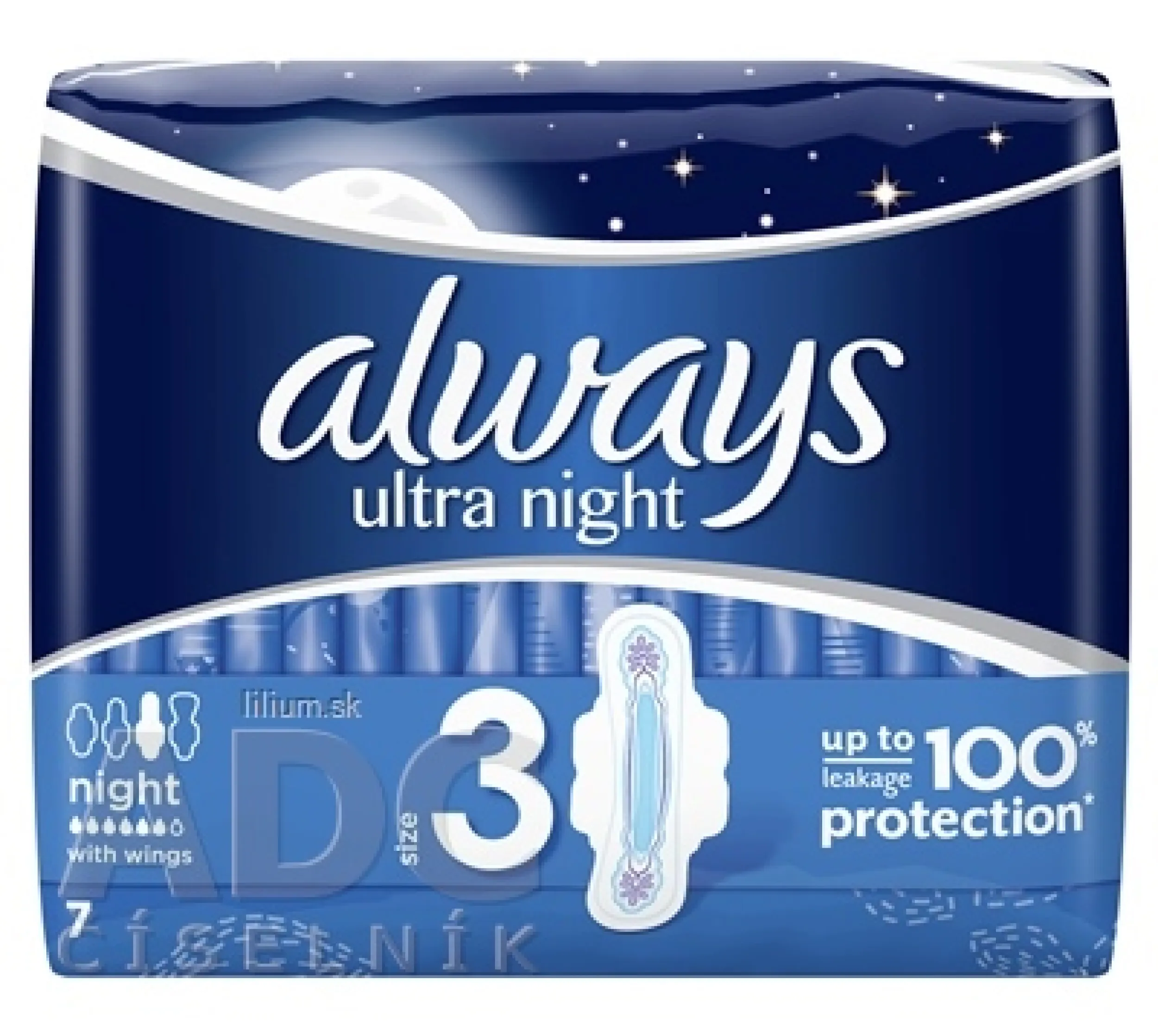 Hygienické vložky Ultra Night v balení po 7 kusov, jednotlivo zabalených.