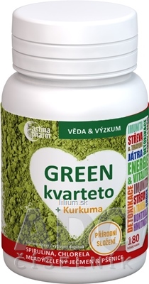 Zloženie: prášok z mladého jačmeňa, prášok z mladej pšenice, spirulina (Spirulina platensis), chlorella (Chlorella vulgaris), kurkuma mletá
