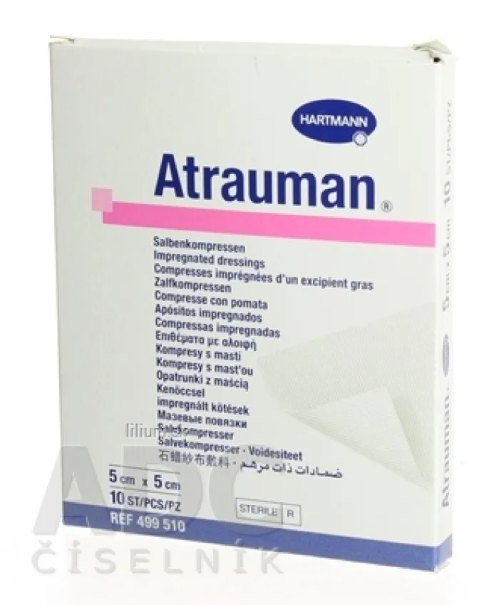 Atrauman® – sterilné krytie s masťou (kompres s rozmerom 5x5 cm).