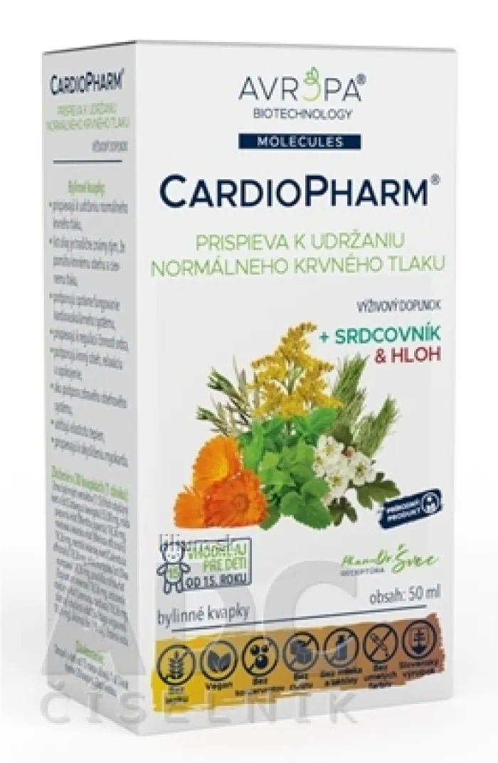 Výživový doplnok. Bylinné kvapky s obsahom bylinnej zmesi extraktov z hlohu obyčajného, mäty piepornej, medovky lekárskej, nechtíka lekárskeho, olivy európskej, prasličky roľnej, srdcovníka obyčajného, zlatobyľu obyčajného.