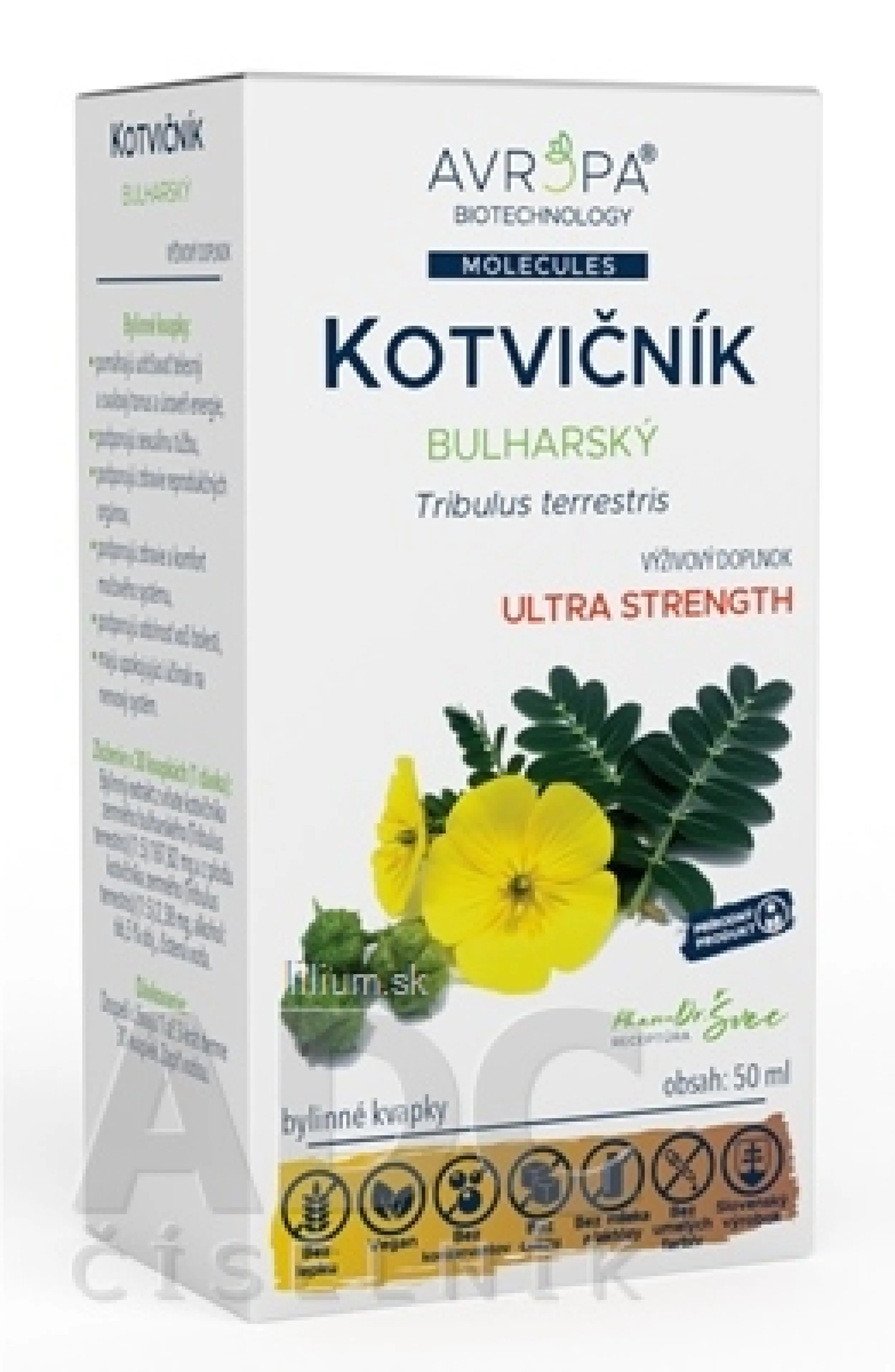 Výživový doplnok, bylinné kvapky obsahujúce extrakt z kotvičníka zemného bulharského (Tribulus terrestris).