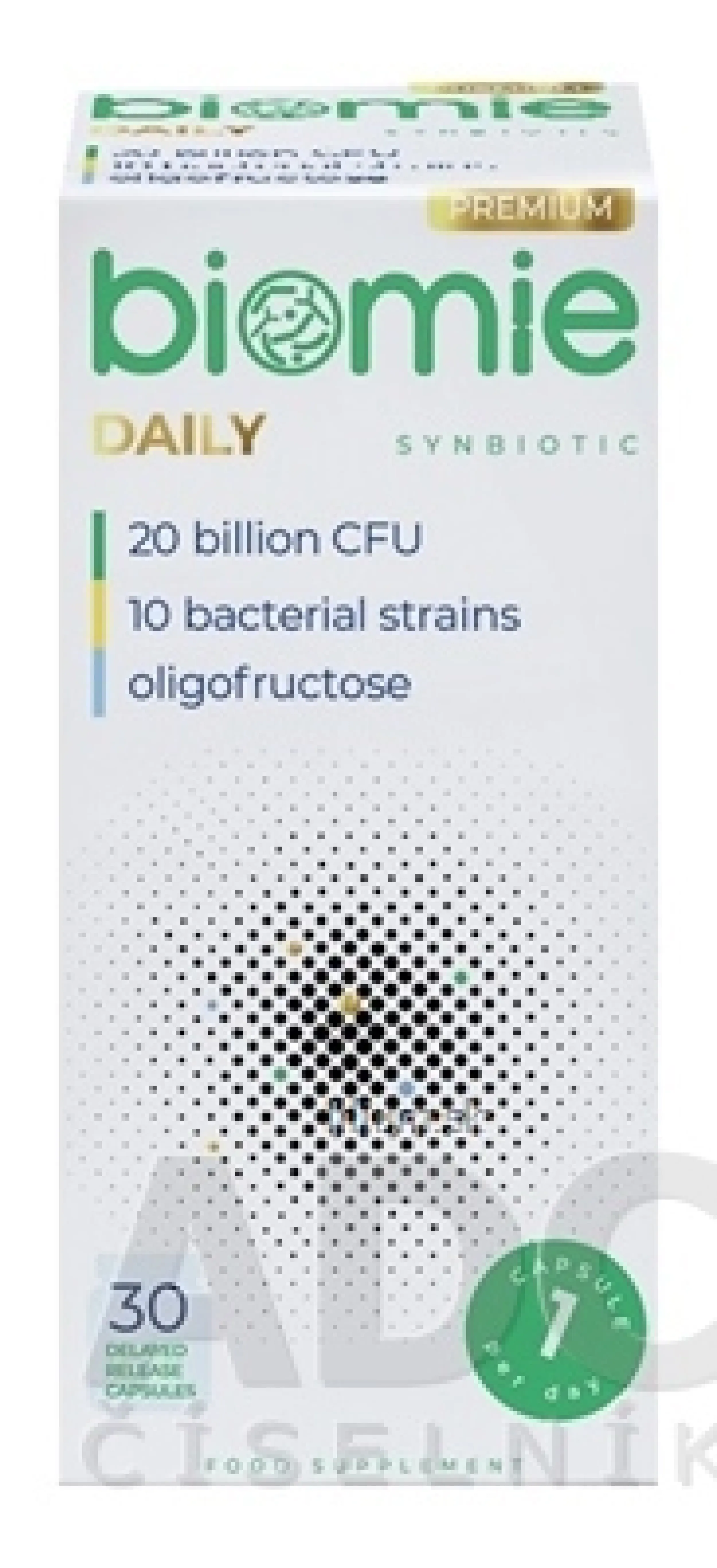 Výživový doplnok obsahuje zmes 10 kmeňov živých lyofilizovaných lakto- a bifidobaktérií v množstve 20 miliárd KTJ* na 1 kapsulu a prírodnú vlákninu, oligofruktózu, získanú z koreňa čakanky.