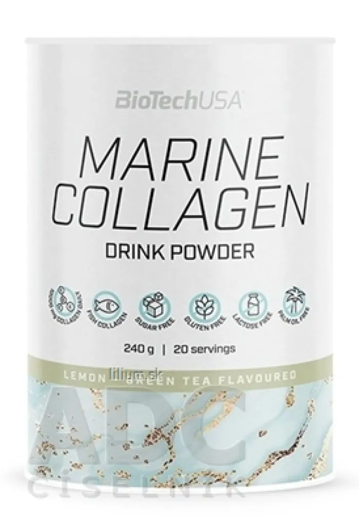 Marine Collagen vďaka 84 % obsahu rybieho kolagénu použitím jednej dávky (12 g) nápoja v prášku vo forme osviežujúceho nápoja dodá nášmu organizmu 10 g kolagénu denne. Kolagén produkuje naše telo, ale s pribúdajúcim vekom je vhodné podporiť jeho produkciu z vonkajších zdrojov konzumáciou kvalitných kolagénových produktov. Vitamín C prispieva k správnej tvorbe kolagénu, a k správnej funkcii nielen pokožky a ciev, ale aj kostí, chrupaviek, zubov a ďasien. Kolagénový nápoj s príchuťou zeleného čaju s citrónom môže byť osviežujúcim nápojom pre vašu každodennú starostlivosť o krásu!