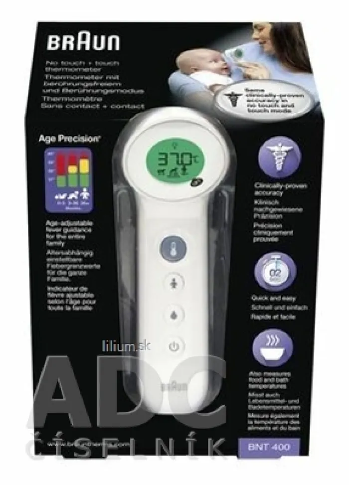 Teplomer BNT400 kombinuje jednoduché používanie dotykového aj hmatového merania s unikátnou technológiou Age of Precision® spoločnosti Braun, ktorá pomáha rodičom eliminovať pochybnosti pri meraní teploty. Extrémne citlivý senzor kombinovaný s inovatívnym optickým systémom zachytáva dvakrát toľko tepla vyžarovaného ľudským telom ako tradičné čelové teplomery. Meranie sa dá vykonať aj počas spánku dieťaťa. Nezabudnite na to, že toto zariadenie meria o 0,5 °C nižšie ako pri digitálnom meraní v konečníku.