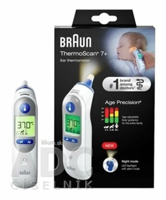 ThermoScan 7+® je ušný teplomer s nočným režimom značky Braun. Používa patentovanú technológiu Age Precision®, ktorá sa zhoduje s výsledkami merania s vekom dieťaťa a umožňuje ich správnu interpretáciu.