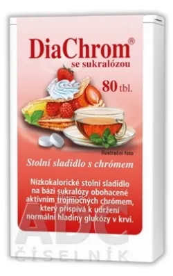 DiaChrom so sukralózou je nízkokalorické stolové sladidlo novej generácie na báze sukralózy (E 955) s obsahom chrómu, ktorý prispieva k udržaniu normálnej hladiny glukózy v krvi a prispieva k správnej látkovej premene makronutrientov (min. 6 mikrogramov Cr/deň tj. 4 tabletky DiaChromu so sukralózou).