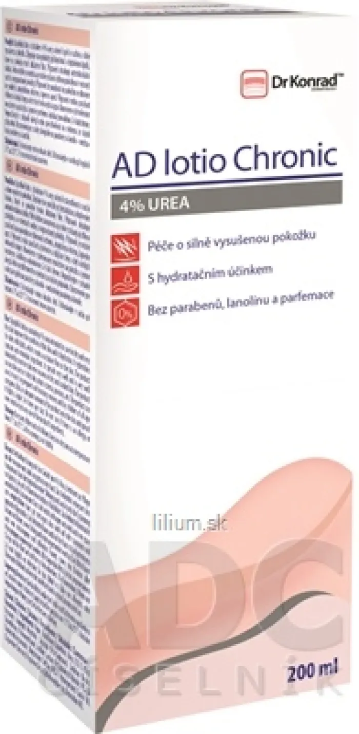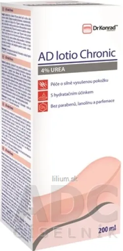 Dr Konrad AD lotio Chronic - lipofilné lotio s obsahom 4% urey určené k starostlivosti o suchú a silne vysušenú pokožku. Zlepšuje stav pokožky jej hydratáciou a doplnením lipidov, ktoré na pokožke tvoria okluzívny film. Prípravok obsahuje antimikrobiálnu zložku. Veľmi dobre sa rozotiera a je dobre znášaný aj citlivou pokožkou a v miestach suchej a rozpraskanej pokožky. Prípravok je možné používať aj na pokožku so sklonom k svrbeniu, atopickému ekzému, lupienke apod. Prípravok môžu používať aj tehotné a dojčiace ženy a deti všetkých vekových skupín. Viac na adcc.sk