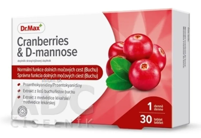 Zloženie: Objemové činidlo (fosforečnany vápenaté), D-manóza, zahusťovadlo (mikrokryštalická celulóza), extrakt z plodov brusnice veľkoplodej (Vaccinium macrocarpon), extrakt z listov Buchu (Agathosma betulina), extrakt z listov medvedice lekárskej (Arctostaphylos uva-ursi), emulgátor (hydroxypropylmetylcelulóza), stabilizátor (zosieťovaná sodná sol karboxymetylcelulózy), leštiaca látka (polyvinylalkohol), protihrudkujúca látka (oxid kremičitý), zvlhčovadlo (polydextróza), protihrudkujúce látky (mastenec, horečnaté soli mastných kyselín), stabilizátor (trietylcitrát), farbivo (oxidy a hydroxidy železa). Viac na adcc.sk
