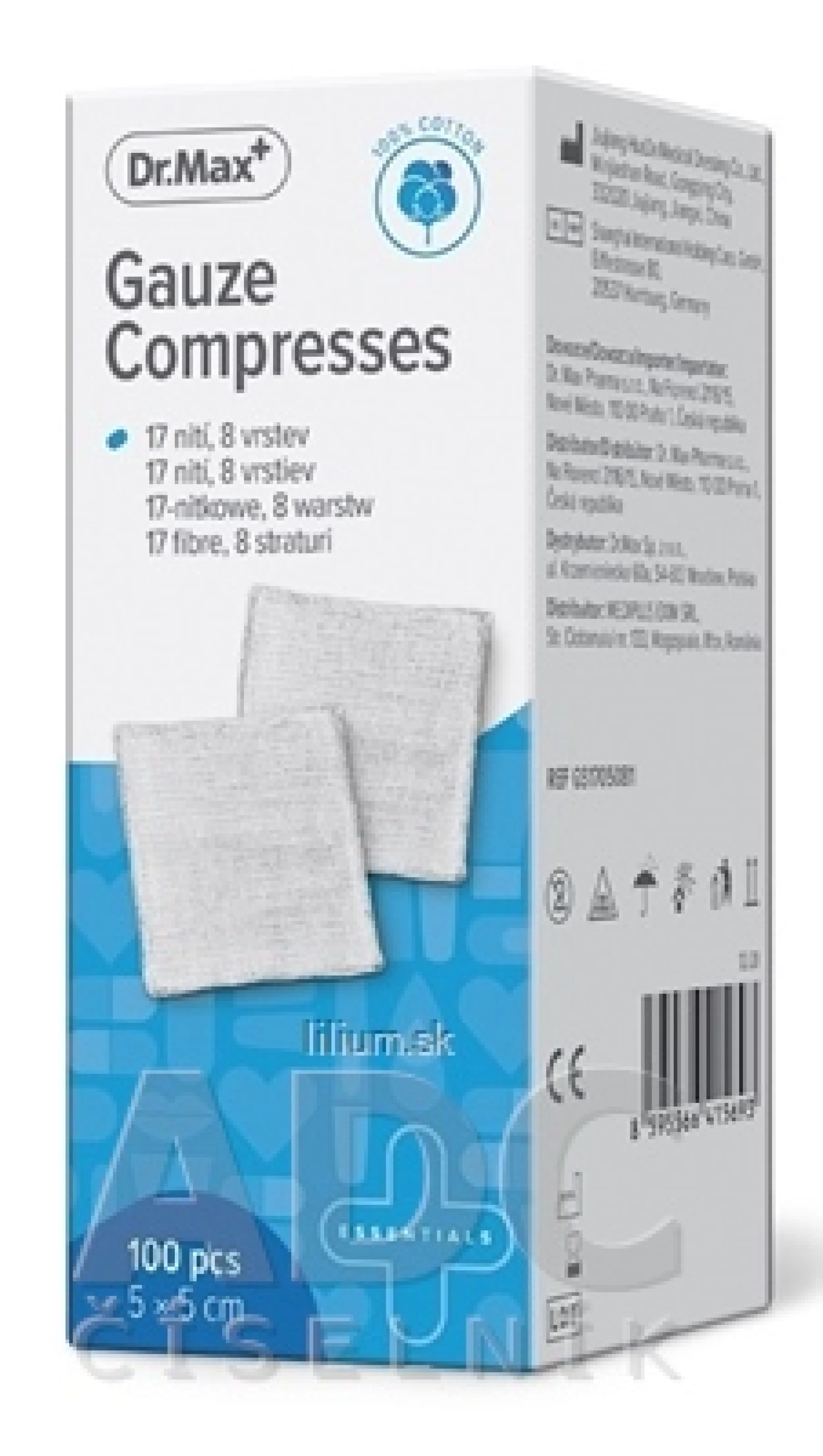 nesterilné gázové kompresy, 8 vrstiev, 17 nití, so zloženými okrajmi, 5x5 cm, 1x100 ks