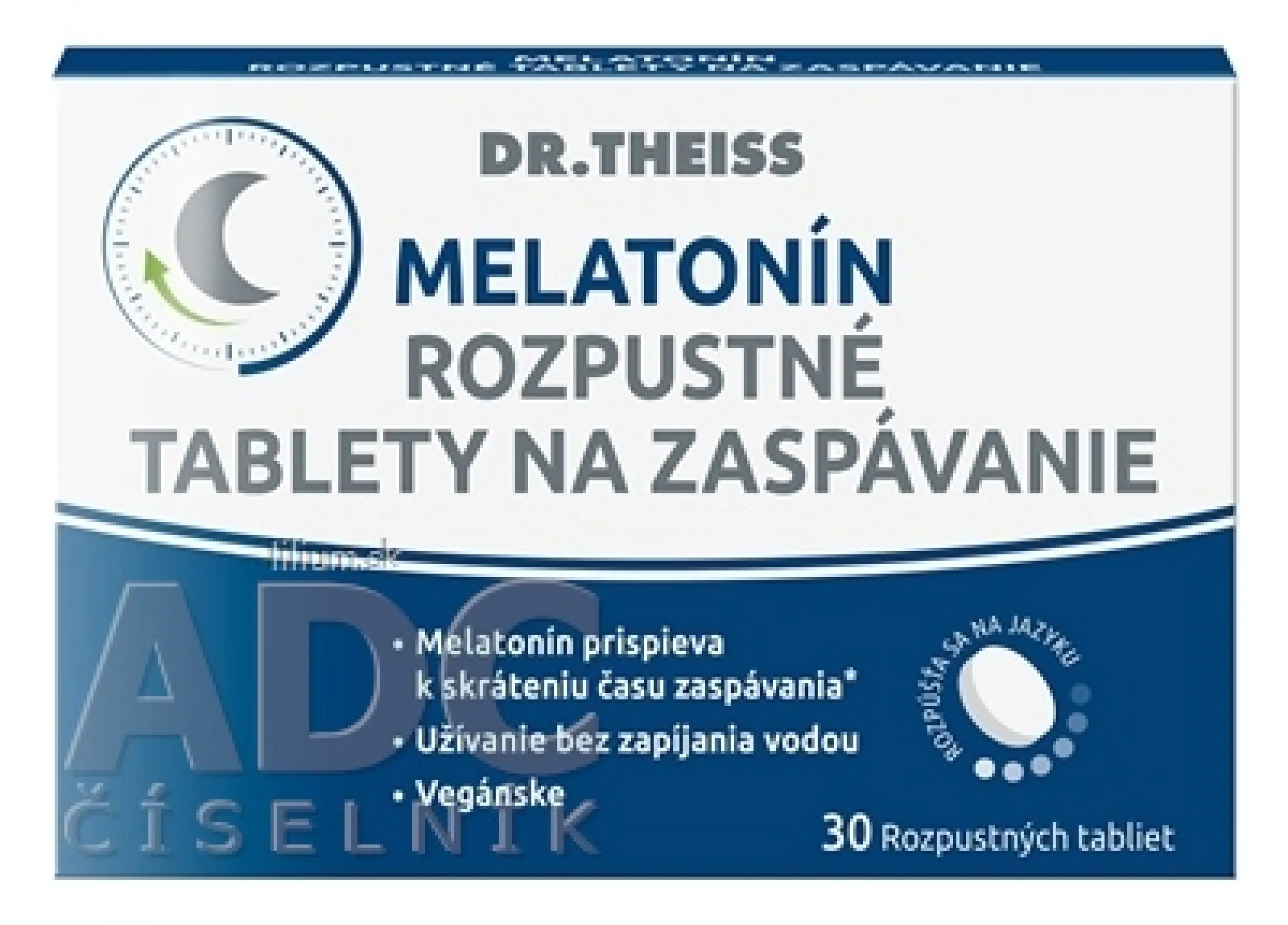 Výživový doplnok s melatonínom a sladidlom, rozpustné tablety na zaspávanie.