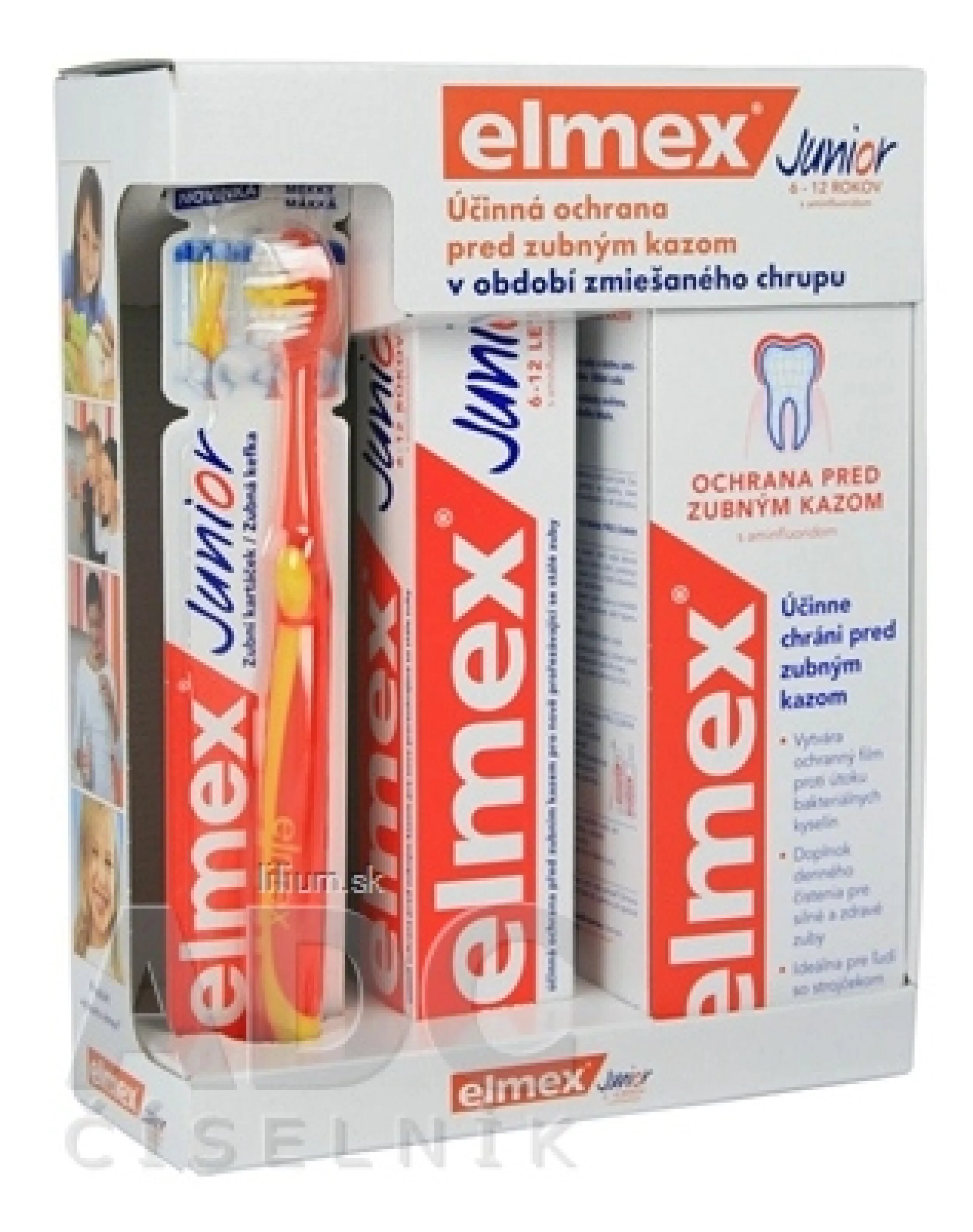 • elmex® Junior s aminfluoridom zubná pasta - poskytuje zubom ideálnu ochranu pred zubným kazom, má príjemnú chuť, ktorú deti akceptujú, motivuje k pravidelnej dentálnej hygiene.