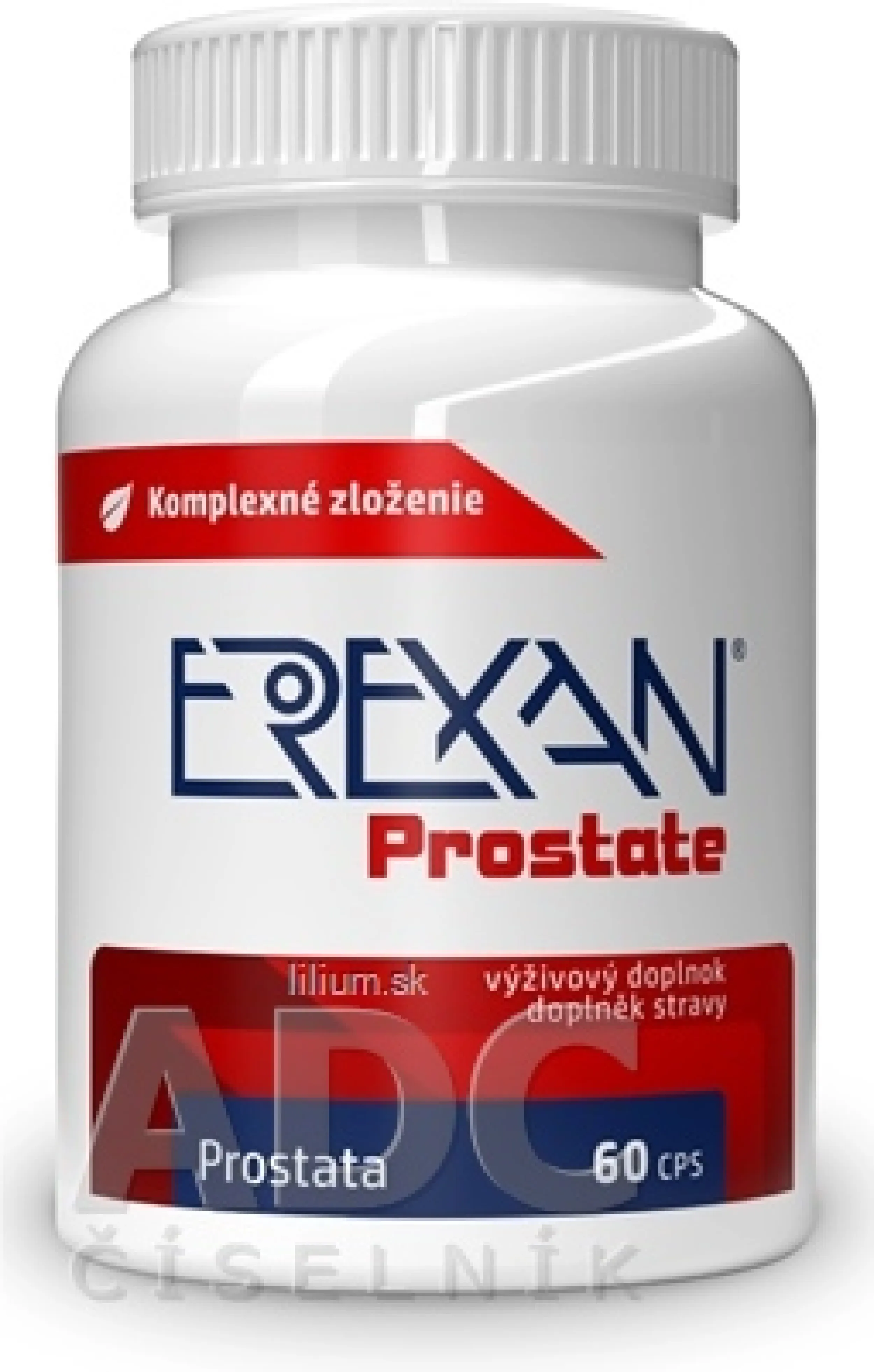 Zloženie: Palma Seronoa plazivá (extrakt 4:1), Pŕhľava dvojdomá (extrakt 1% kyseliny kremičitej), Ginkodvojlaločné (extrakt 24/6 flavonoidy/laktóny), Rajčiny (extrakt s 5% lykopénu), Zinok (citrát zinočnatý), rastlinné horečnaté soli mastných kyselín (protihrudkujúca látka), Celulóza (kapsula). Palma Seronoa plazivá (sabalová). Viac na adcc.sk