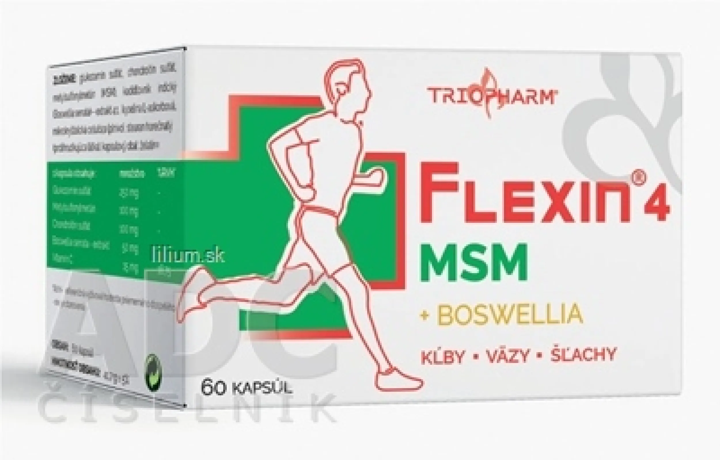 1 kapsula obsahuje : Glukozamín sulfát 250 mg, Metylsulfonylmetán 100 mg, Chondroitín sulfát 100 mg, Boswellia serrata – extrakt 4:1 50mg, vitamín C 15 mg (18,75 % RVH).