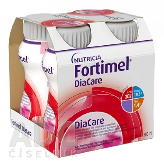 Obsahuje cukry a sladidlá. Na diétny režim pri podvýžive súvisiacej s ochorením u pacientov s diabetes mellitus alebo hyperglykémiou. Fortimel DiaCare je vysokoenergetická tekutá výživa s vysokým obsahom bielkovín. Obsahuje vlákninu. Bezgluténový. Balené v ochrannej atmosfére. Viac na adcc.sk