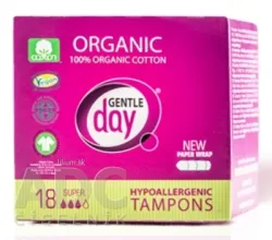 Hygienické tampóny Gentle Day Regular sú vyrobené zo 100 % organickej bavlny, ktorá je šetrná k pokožke aj k prírode. Balenie obsahuje 18 kusov tampónov. Tampóny Gentle Day nie sú chemicky ošetrované a ich používaním sa nevystavujete škodlivým chemikáliám, predchádzate nepríjemnému podráždeniu a alergiám. Každý tampón je samostatne zabalený v sterilnom papierovom obale.