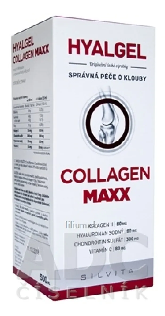 Výživový doplnok HYALGEL COLLAGEN MAXX obsahuje kolagén II, hyaluronan sodný, chondroitín sulfát a vitamín C.