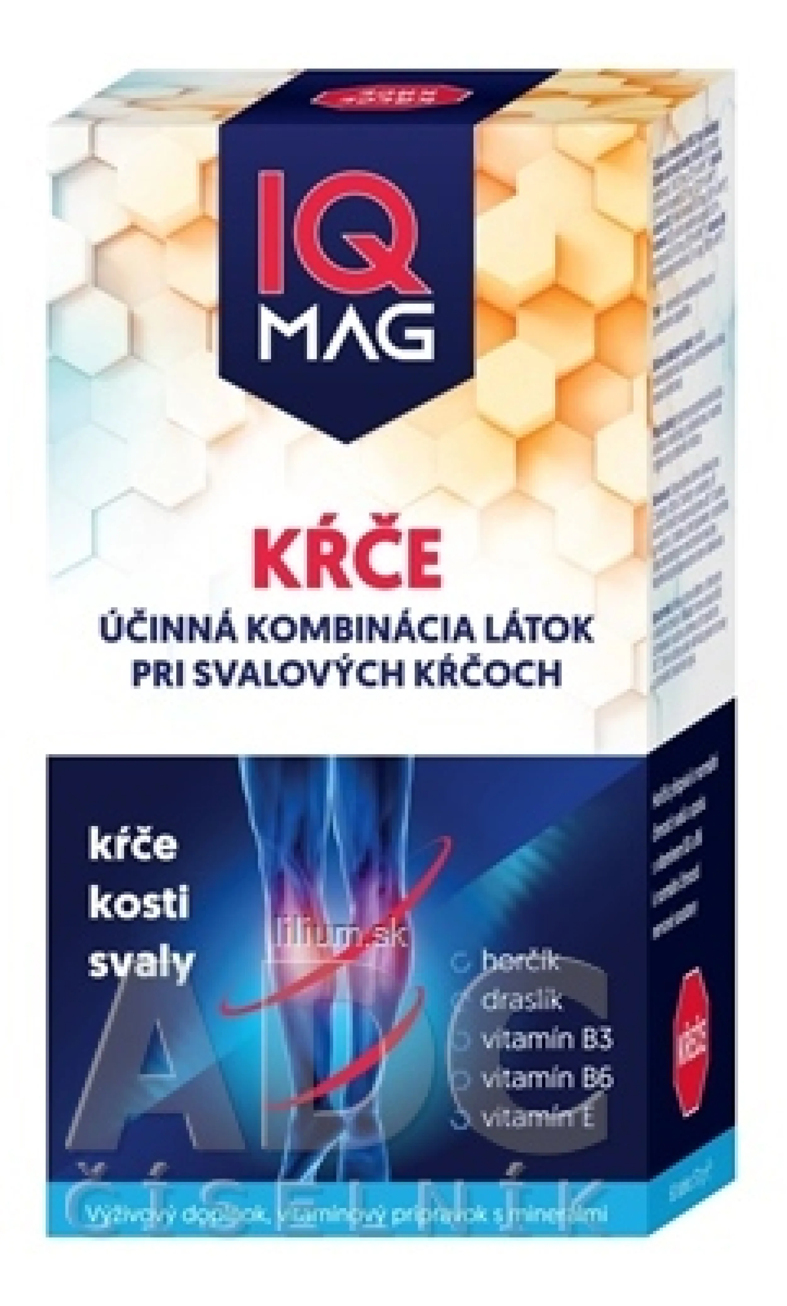 Zloženie: horčík (citran horečnatý) 93,75 mg (25 % RVH*), draslík (chlorid draselný) 25 mg (1,25 % RVH*), vitamín B3 (nikotínamid) 8,0 mg (50 % RVH*), vitamín E (DL-alfa-tokoferol acetát 50 % enkapsulát) 6,0 mg (50 % RVH*), vitamín B6 (pyridoxínhydrochlorid) 1,4 mg (100 % RVH*).