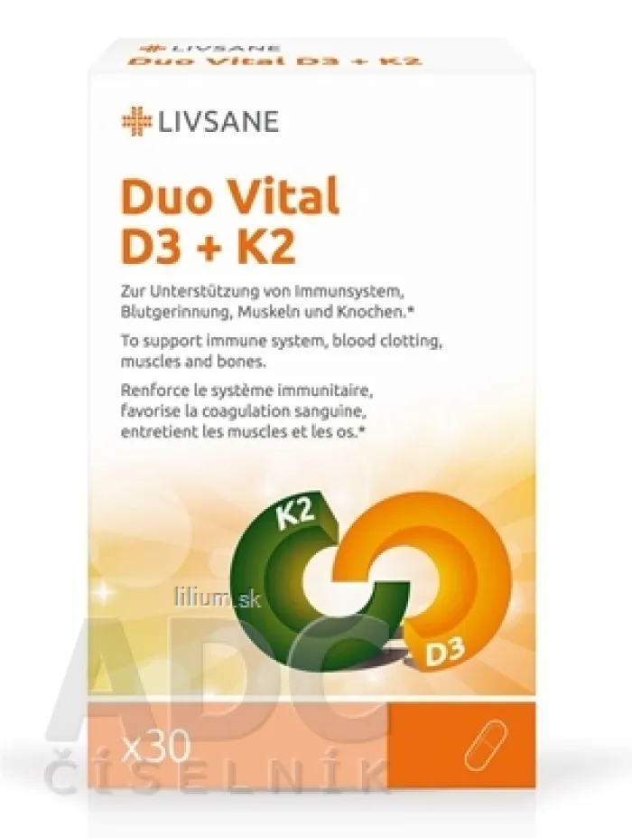 Výživový doplnok, obsahuje vitamín D3 (20 μg) a K2 (80 μg).