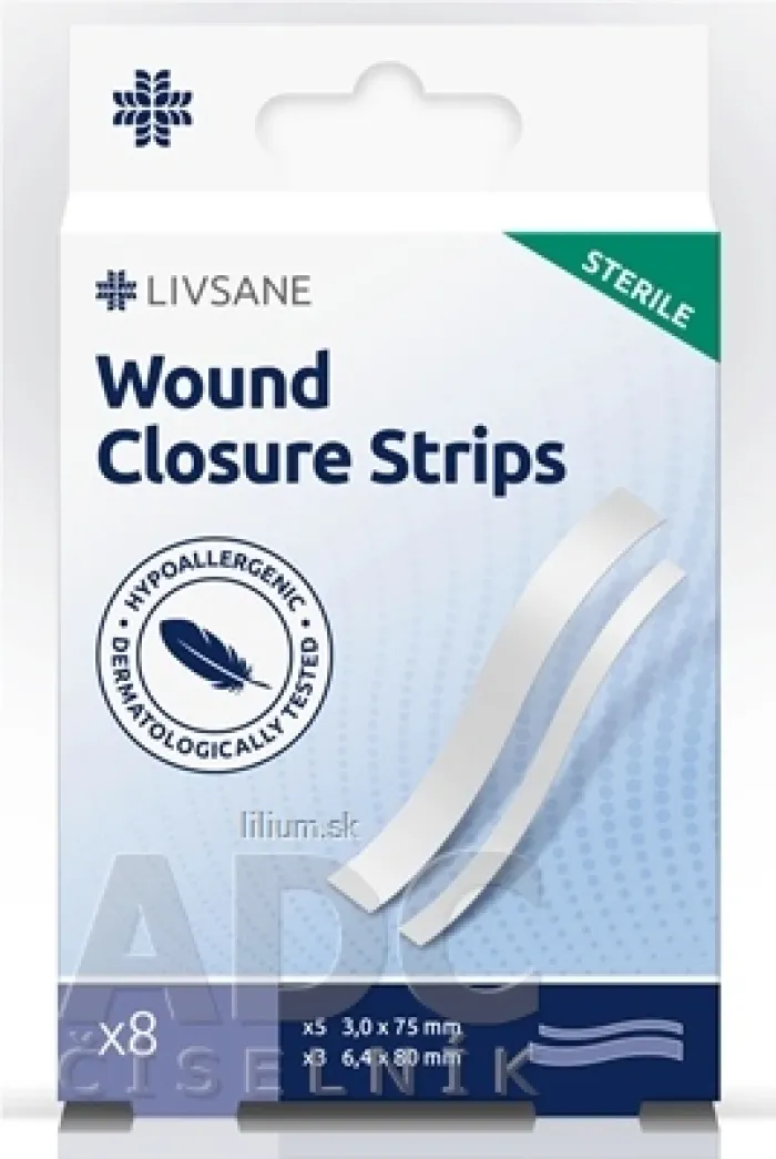 Náplasťové stehy. Lepiace prúžky na uzatvorenie rezných rán, 2 veľkosti: 3,0 x 75 mm 5 kusov a 6,4 x 80 mm 3 kusy.