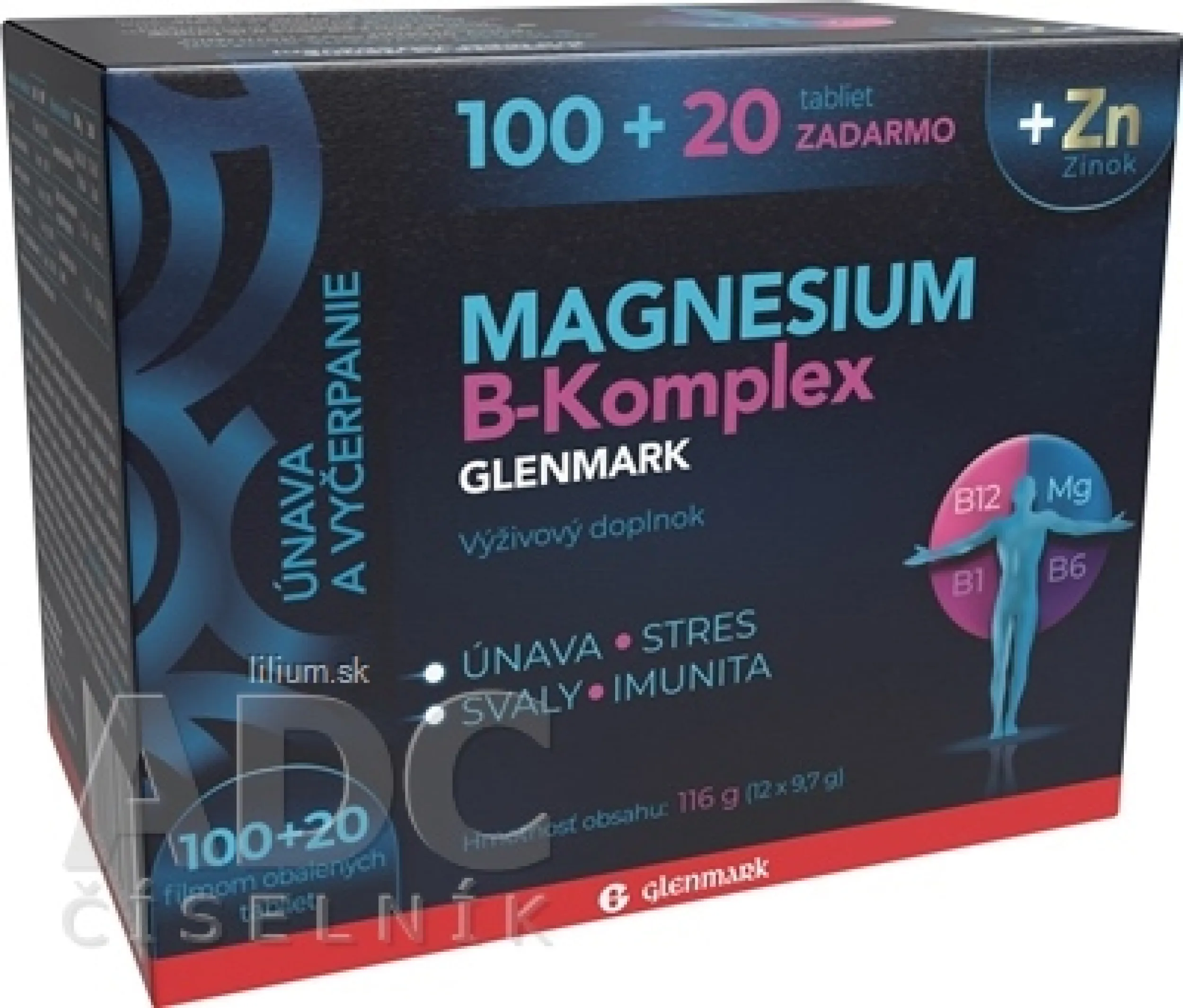 horčík (uhličitan horečnatý) - 375 mg (100 %), zinok (oxid zinočnatý) - 8 mg (80 %*), vitamín B6 (pyridoxínhydrochlorid) - 1,4 mg (100 %*), vitamín B1 (tiamín mononitrát) - 1,1 mg (100 %), vitamín B12 (kyanokobalamín) - 2,5 µg (100 %*).