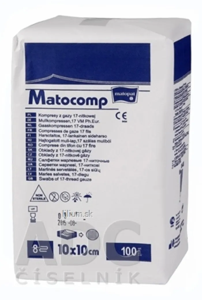 Nesterilný kompres zo 17 nitkovej gázy, 8 vrstvový s rozmerom 10x10 cm.