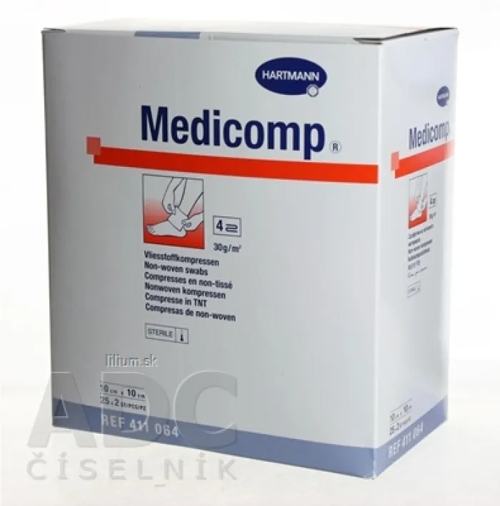 Sterilné kompresy z netkaného textilu, nasiakavé, priedušné, mäkké kompresy, sterilné (zlozenie: 60 % viskóza a 34 % polyesterové vlákna). Gázové kompresy sa použijú na ošetrenie alebo kratie rôznych typov rán.