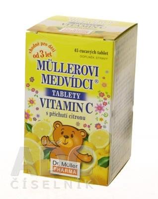 Výživový doplnok so sladidlom, tablety na cmúľanie v tvare medvedíkov s obsahom vitamínu C: