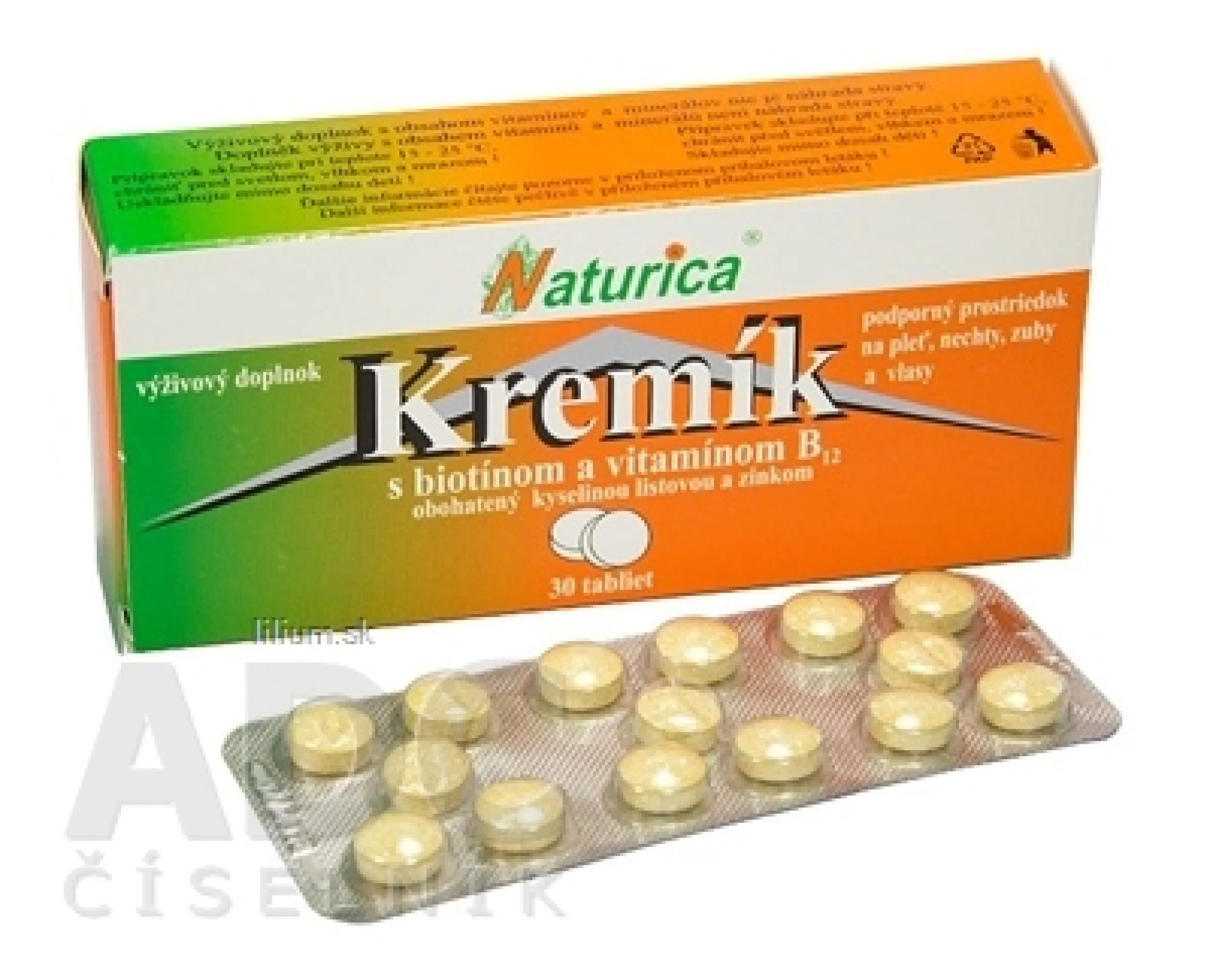 Výživový doplnok s obsahom kremíka, biotínu, vitamínu C, vitamínu B12, kys. listovej a zinku.