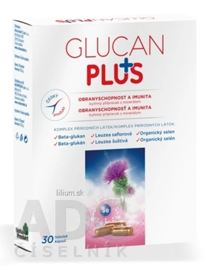 Výživový doplnok, bylinný prípravok s minerálom. Kombinovaný prípravok s obsahom beta-glukánu, výťažku z leuzey šuštivej a selénu.