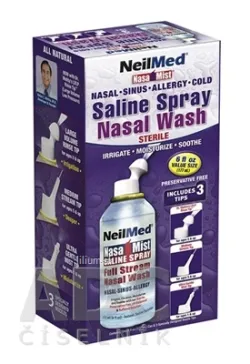 NasaMist All-In-One je prírodný, soľný roztok na hydratáciu nosa a pre jeho oplach. Soľný sprej