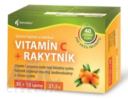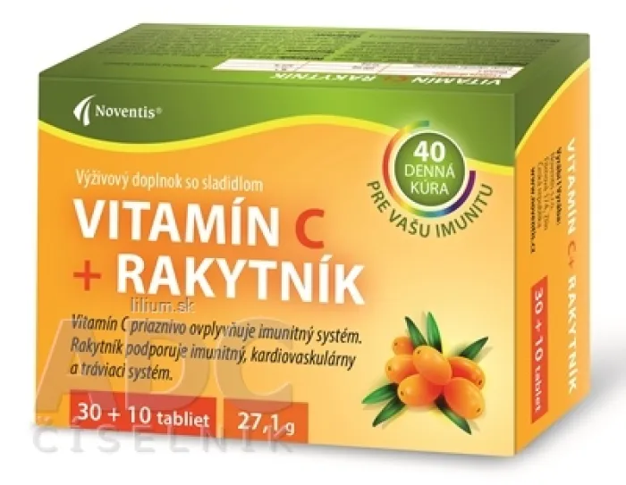 1 tableta obsahuje: Vitamín C 500 mg (kyselina askorbová) (625 % referenčnej výživovej hodnoty) a Extrakt rakytníka rešetliakového 50 mg.