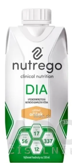 Nutrične kompletná izokalorická výživa s nízkym glykemickým indexom a rozpustnou vlákninou určená pri podvýžive alebo jej riziku u pacientov s diabetes mellitus alebo hyperglykémiou. Rozpustná vláknina podporuje správnu funkciu čriev. Nutrego DIA je možné použiť aj u pacientov s nadváhou alebo obéznych na vyrovnanie nutričného deficitu. Neobsahuje lepok ani laktózu, je teda vhodná pri laktózovej intolerancii alebo celiakii.