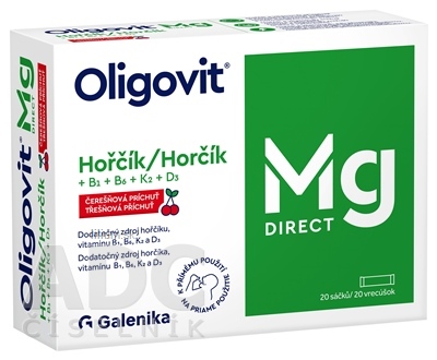 Výživový doplnok Oligovit® Mg DIRECT, prášok na priame perorálne použitie obsahuje dodatočný zdroj horčíka, vitamínu B1, B6, K2 a D3.
