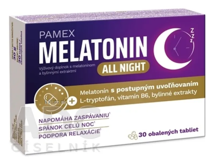 Výživový doplnok s melatonínom, extraktmi z mučenky, valeriány a medovky a vitamínom B6.