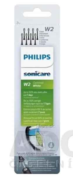 Výmenné kefkové hlavice W2 Optimal White. Možno ich nasadiť na telá všetkých zubných kefiek Philips Sonicare s výnimkou modelov Philips One a Essence. Na dokonalé odstránenie pigmentácií, vhodné tiež v priebehu bielenia zubov.