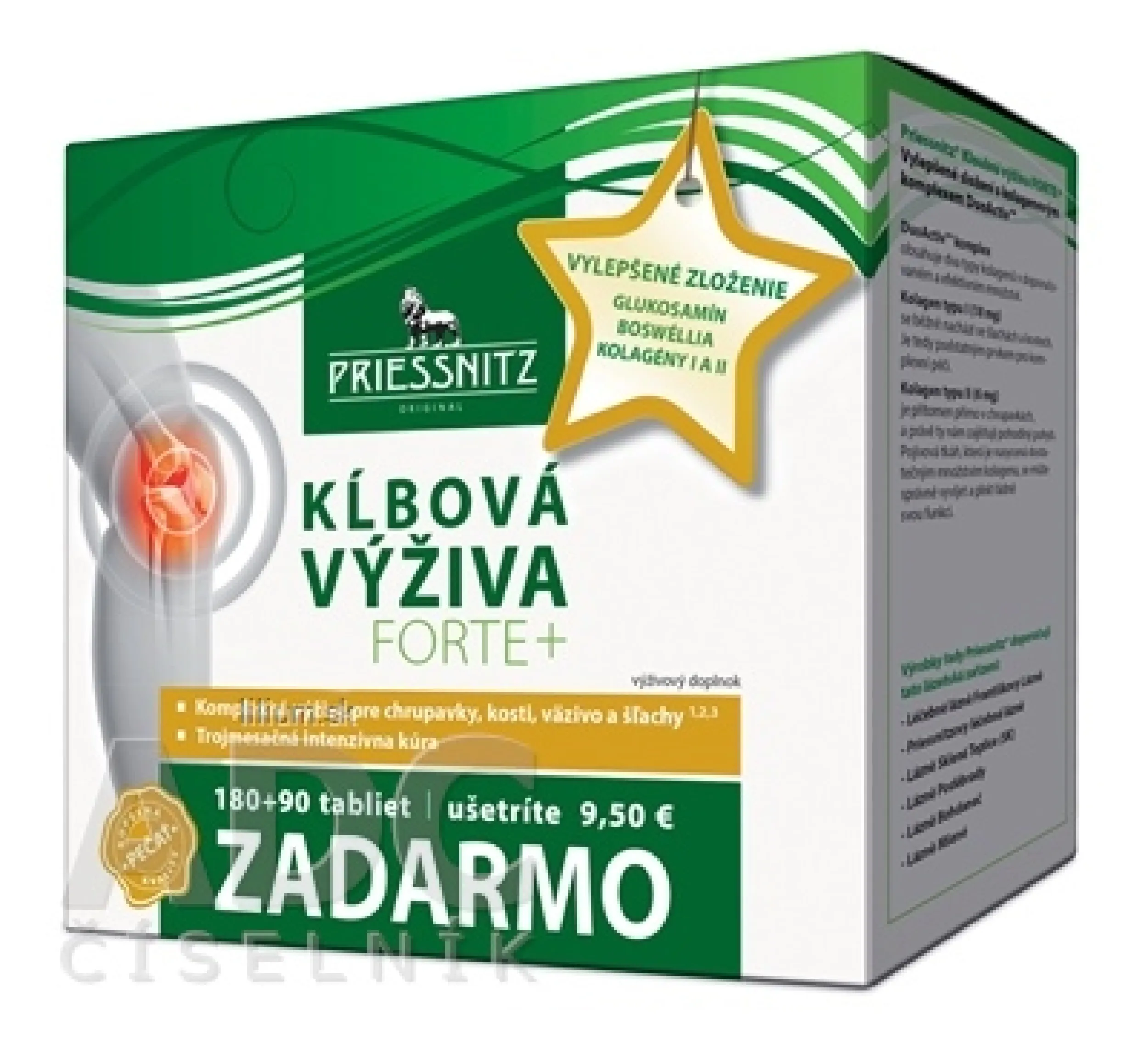 Priessnitz® Kĺbová výživa FORTE + je výživový doplnok v tabletách. Trojmesačná intenzívna kúra. Jednotlivé zložky prispievajú: