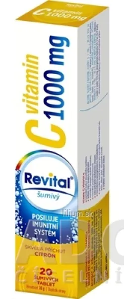 Výživový doplnok Revital® vitamín C 1000 mg šumivý s príchuťou citrón - tablety s obsahom vitamínu C. Výrobok obsahuje 1000 mg vitamínu C (kyselina L-askorbová) a 120 mg inulínu - vlákninu z čakanky.