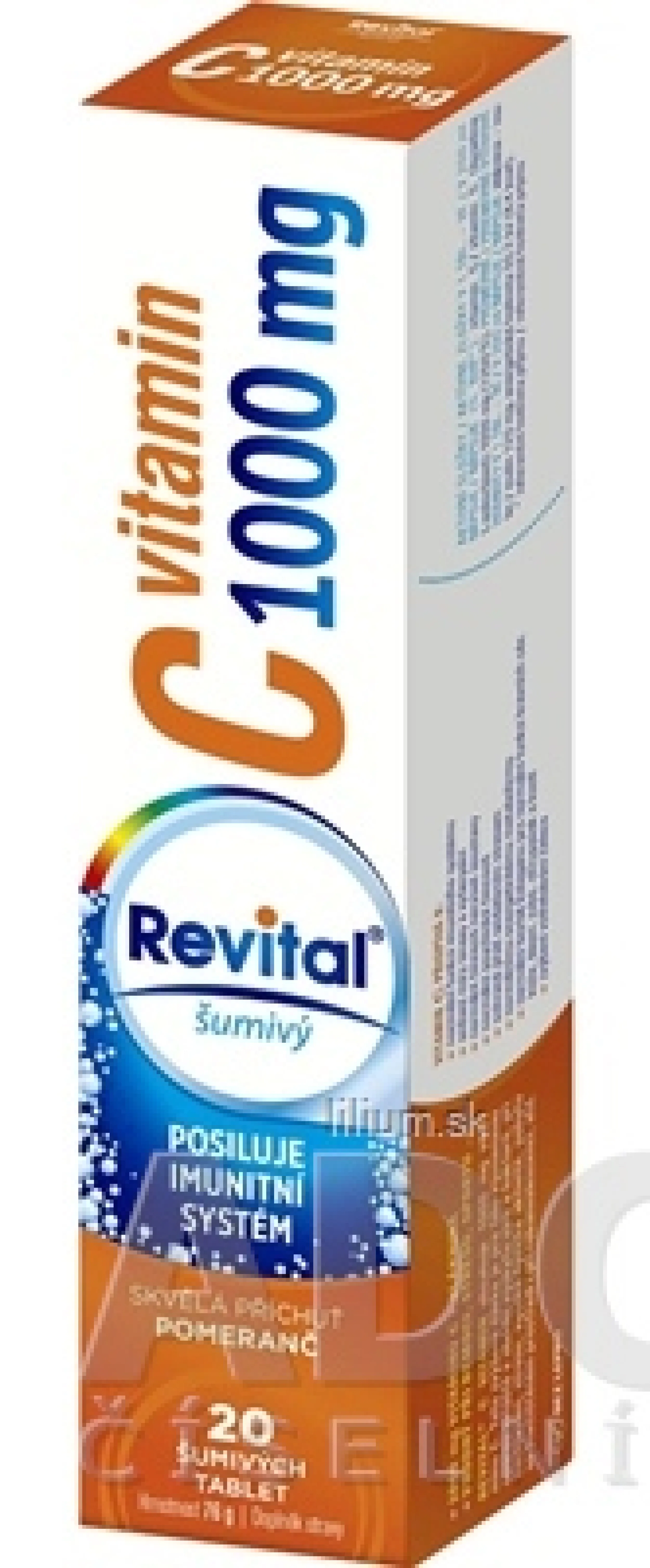 Výživový doplnok Revital® vitamín C 1000 mg šumivý s príchuťou pomaranč - tablety s obsahom vitamínu C. Výrobok obsahuje 1000 mg vitamínu C (kyselina L-askorbová) a 120 mg inulínu - vlákninu z čakanky.