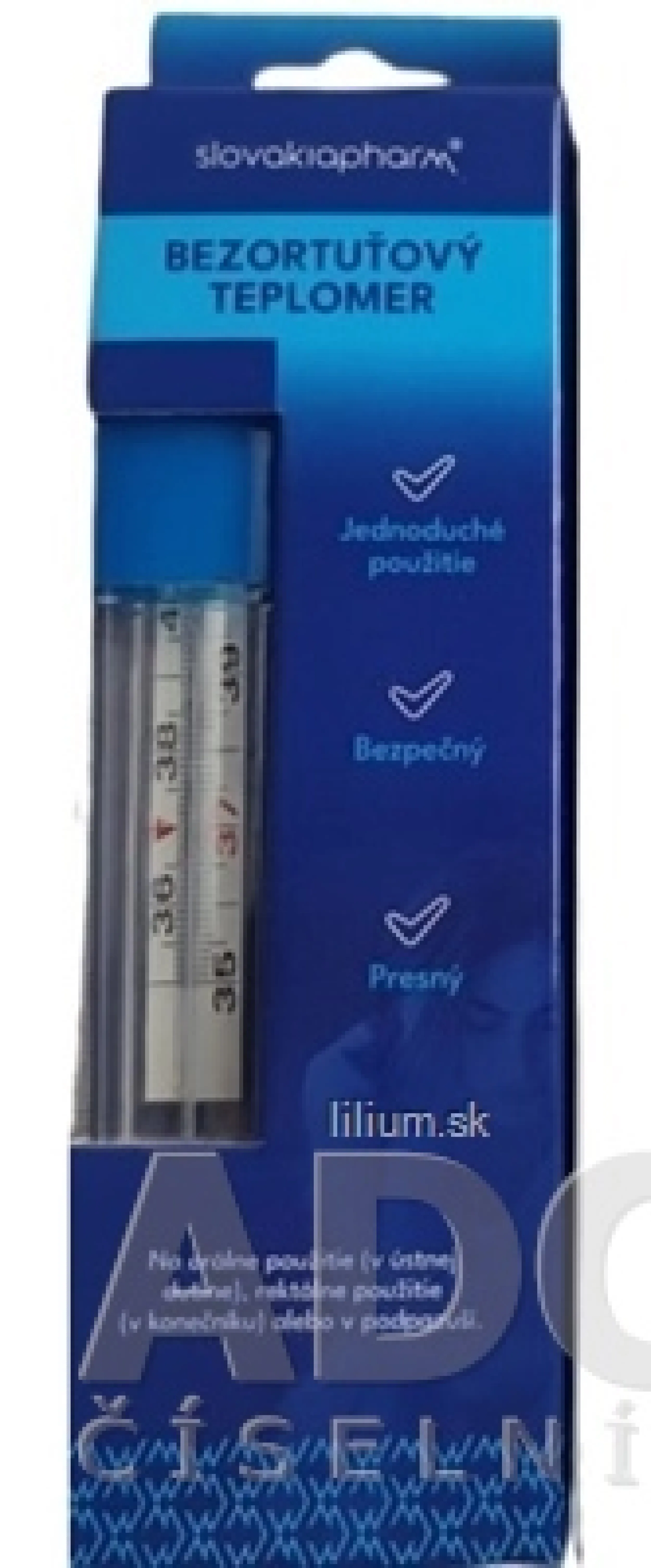 Bezortuťový teplomer s gáliom je určený na orálne použitie (v ústnej dutine), rektálne použitie (v konečníku) alebo v podpazuší. Balenie obsahuje 1 teplomer v ochrannom puzdre.