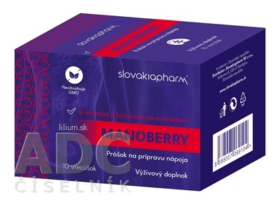 Slovakiapharm MANOBERRY obsahuje 10 vrecúšok s D-manózou 2000 mg a brusnicovým extraktom (60 mg PAC). Viac na adcc.sk