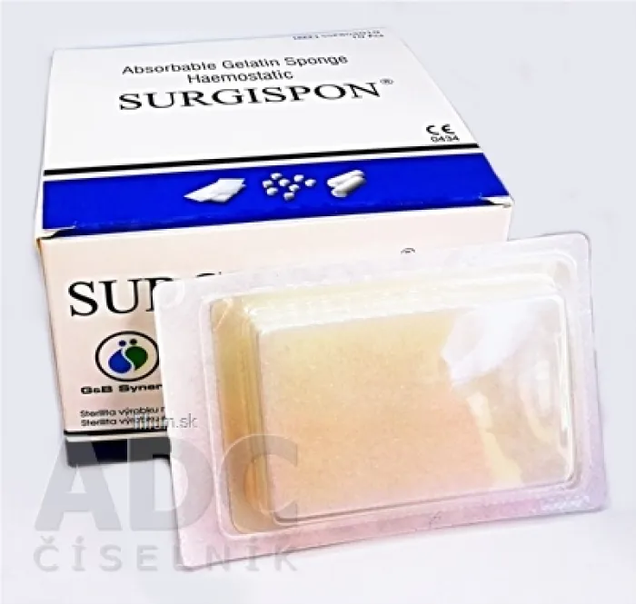 Vstrebateľná hemostatická želatínová špongia. Sterilná, tvárna, vo vode nerozpustná vstrebateľná špongia je určená pre hemostatické použitie pre aplikáciu na krvácajúci povrch.