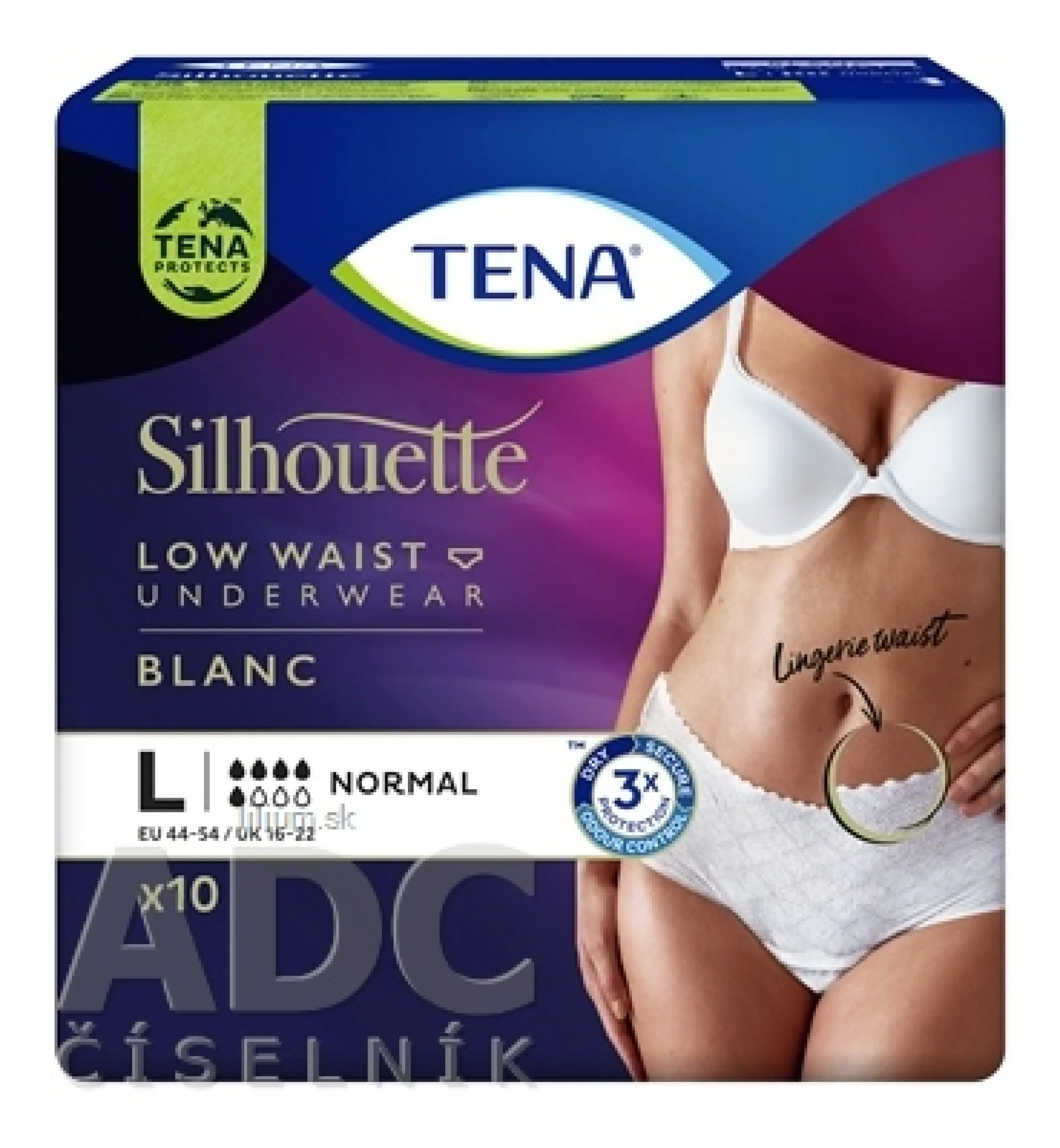 Absorpčné spodné prádlo TENA Silhouette Normal pre ženy so strednou až ťažkou inkontinenciou. Hebké ako bavlna so zníženým krajkovým pásom vyzerajú úplne ako bežná spodná bielizeň.