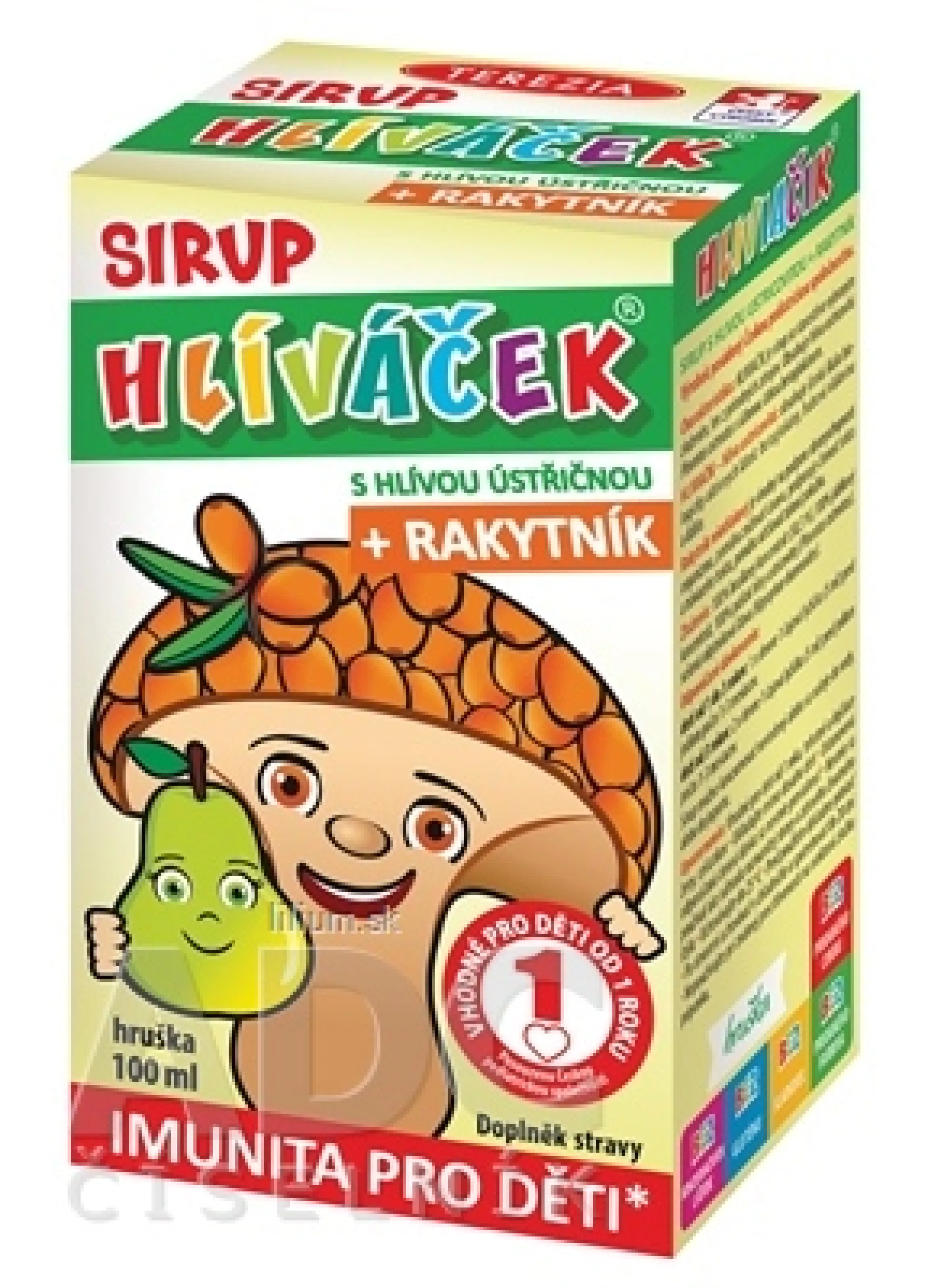 Sirup s hlivou ustricovitou a rakytníkom s príchuťou hrušky, bez konzervačných látok, bez gluténu, bez pridaného farbiva, bez sladidiel a cukru. Odmerka je súčasťou balenia.