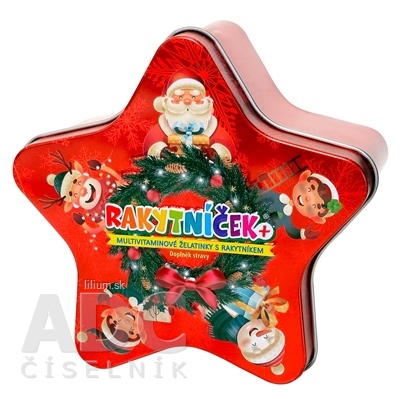 Výživový doplnok. Multivitamínové želatínky obsahujú rakytník a zmes ovocných koncentrátov a vitamíny (20% ovocnej šťavy a 9 vitamínov).