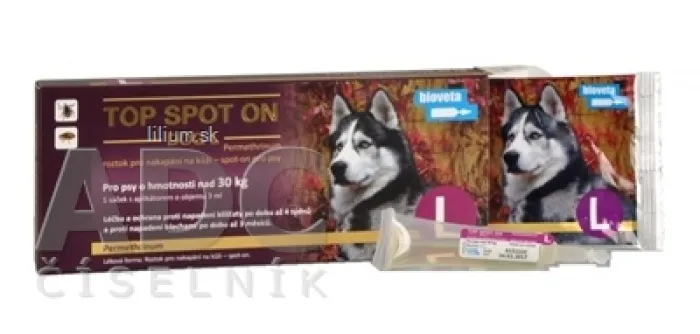 Roztok na nakvapkanie na kožu – spot-on pre psy. 1 aplikátor (3 ml) obsahuje účinnú látka Permethrinum 1950 mg.