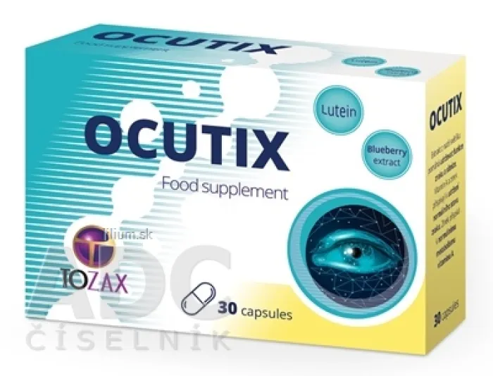 Výživový doplnok s obsahom Luteínu, Zeaxantínu, Extraktu z plodov čučoriedok, Extraktu z vňate očianky (Euphrasia sp.), Vitamínu A (retinyl-palmitát), Vitamínu B1 (tiamínhydrochlorid), Vitamínu E (D-alfa-tokoferol), Zinku (glukónan zinočnatý).