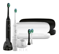 Sada dvoch sonických kefiek, 2 cestovné puzdra, 2 nabíjacie stanice a 4 hlavice štandard v balení, 4 režimy čistenia, výdrž batérie 30 dní, automatický časovač, upozornenie na rovnomerné čistenie, 70 000 pohybov za minútu.