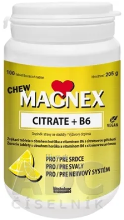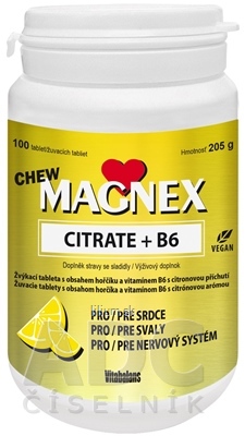 Výživový doplnok vo forme žuvacích tabliet s obsahom horčíka (magnézium citrát) a vitamínu B6 s citrónovou príchuťou.
