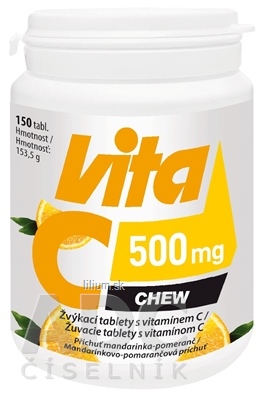 Žuvacie tablety s vitamínom C. Mandarínkovo-pomarančová príchuť.